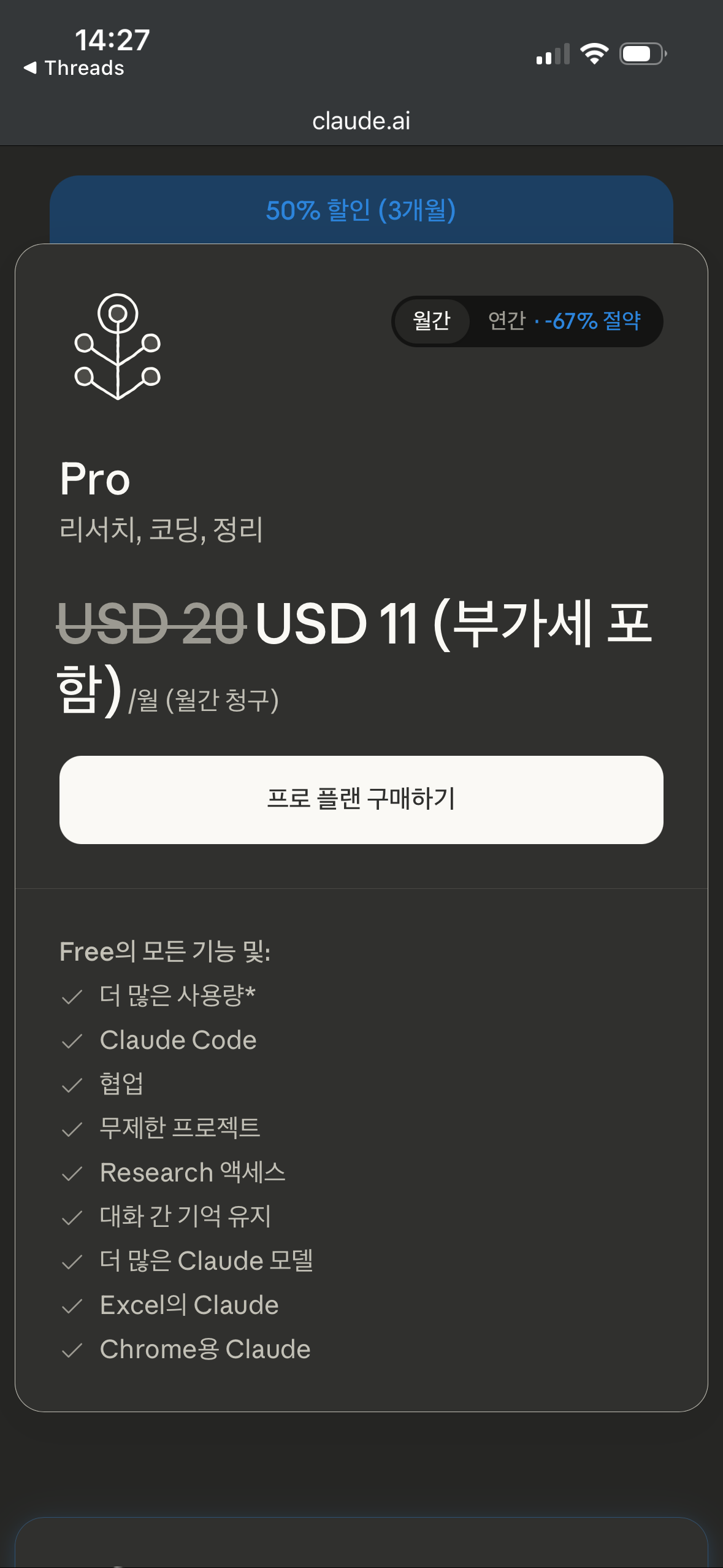 할인링크 주소로 접속 시 할인 구독 적용 *신규가입자만 - 기존에 구독한 적이 없거나, 해당 혜택을 받아본 적이 없는 유저만 *기타 무료혜택을 받아본 적이 없는 유저만 링크 : https://claude.ai/acquired