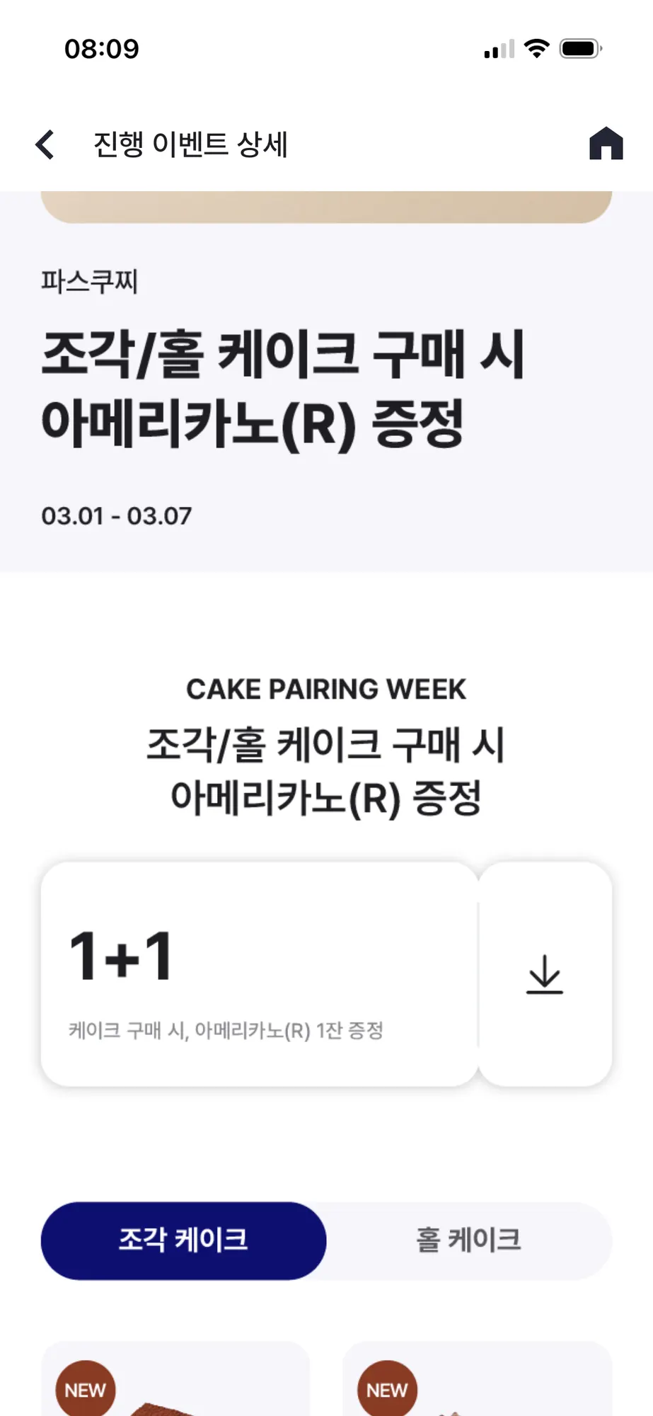 증정조각/홀 케이크 구매 시 아메리카노(R) 증정 쿠폰 일별 선착순 한정수량 발급 타음료 교환불가 링크 : https://napi.happypointcard.com/page/event/event-view.spc?eventseq=46d68efa78c0c3c44e954bc813c72684&share=Y