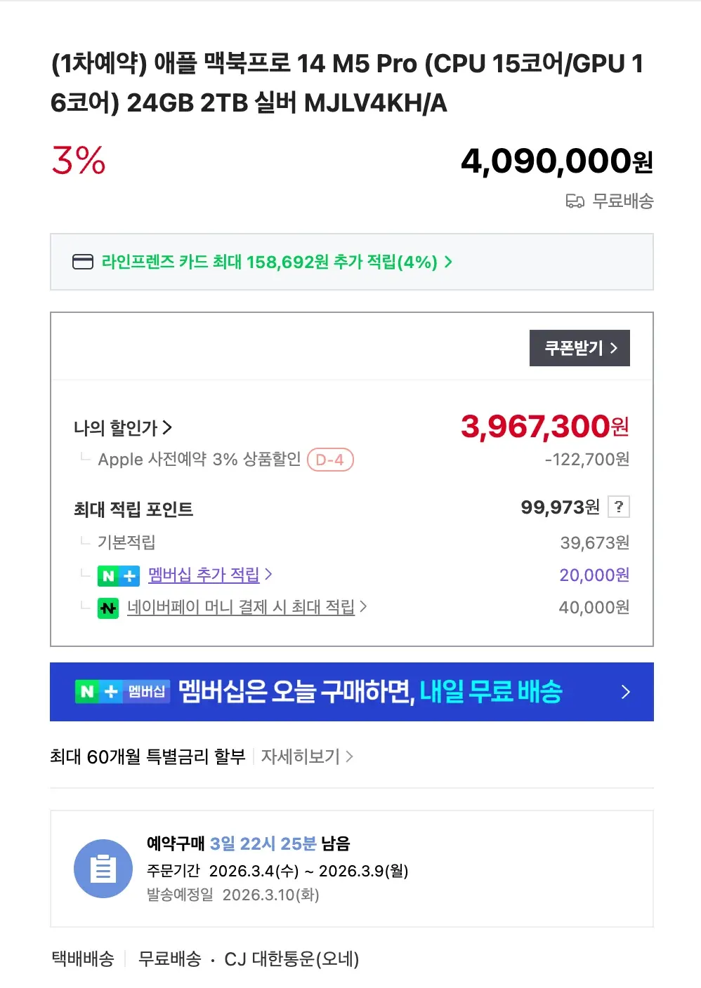 (1차예약) 애플 맥북프로 14 M5 Pro (CPU 15코어/GPU 16코어) 24GB 2TB 실버 MJLV4KH/A