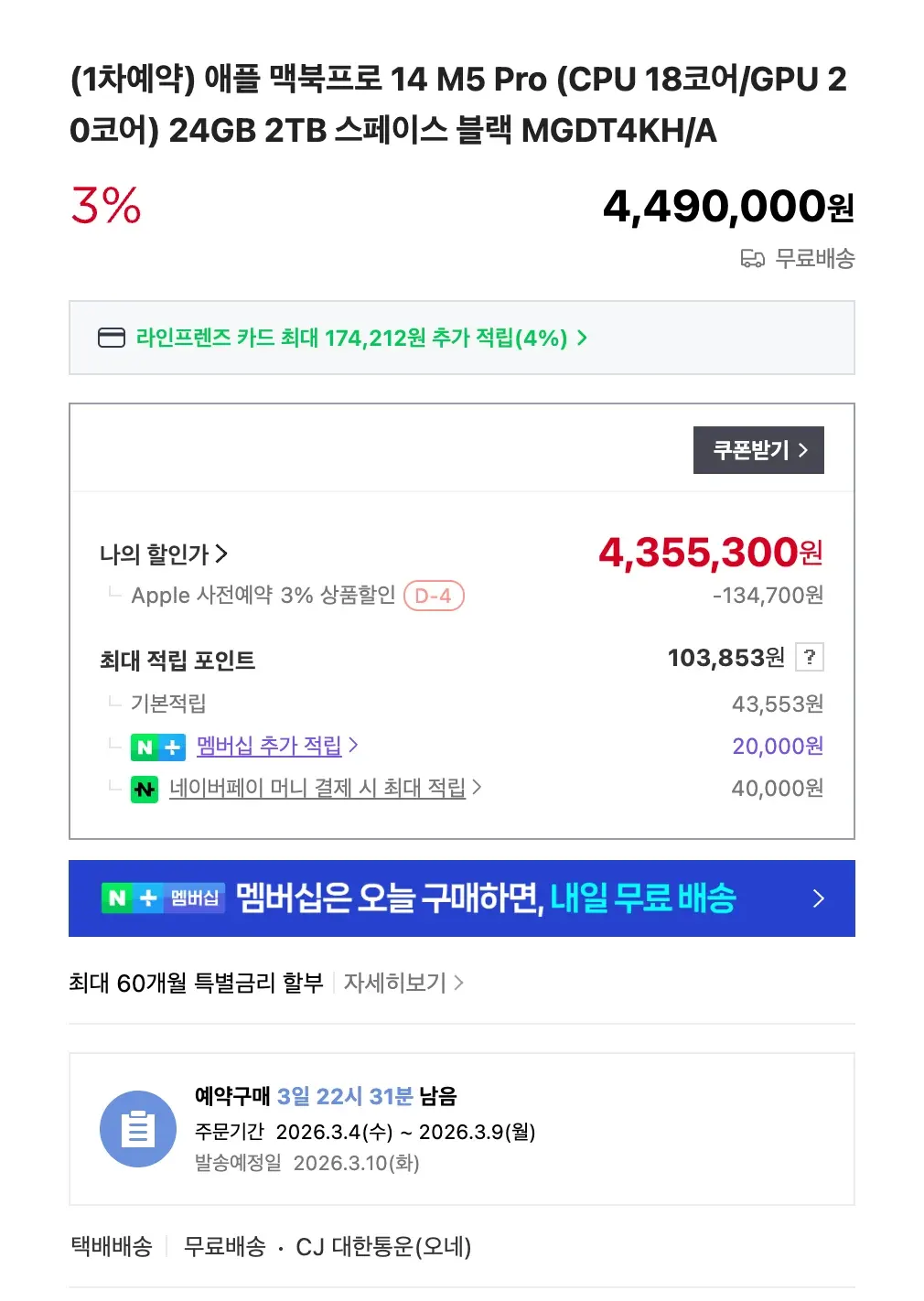 (1차예약) 애플 맥북프로 14 M5 Pro (CPU 18코어/GPU 20코어) 24GB 2TB 스페이스 블랙 MGDT4KH/A - 이미지 1